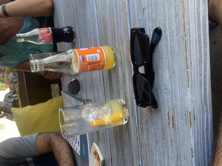 The scene depicts a casual outdoor or semi-outdoor dining/bar environment at Ouzoh La Meze Bar, located on Posidonos Avenue in Paphos Municipality, Cyprus. The primary focus is a light blue, distressed wooden table with various items. In the foreground, a pair of black, rectangular sunglasses rests on the table. To their left, a tall, clear glass contains ice cubes, a small amount of yellow liquid consistent with lemonade or orange juice, and a single orange peel strip. Immediately to the right of this glass is a clear glass bottle of Fanta Orange, approximately half full. Further right and slightly behind the Fanta bottle is another clear glass bottle, approximately half full, containing a dark liquid consistent with Coca-Cola. On the left side of the table, a partial view of a white rectangular plate holds a small quantity of light brown, whole nuts, consistent with almonds. Behind the plate, a dark blue menu or booklet with a light-colored geometric pattern is visible, bearing the word "OUZOH" in white text. Two individuals are partially visible at the table. On the left, the forearm and upper arm of a person wearing a grey short-sleeved shirt are seen. On the right, the forearm and partial torso of a person wearing a green and blue patterned top are visible. In the blurred background, other patrons are seated on dark brown seating with bright yellow cushions, indicative of a lounge-style area. The overall lighting suggests daylight conditions.