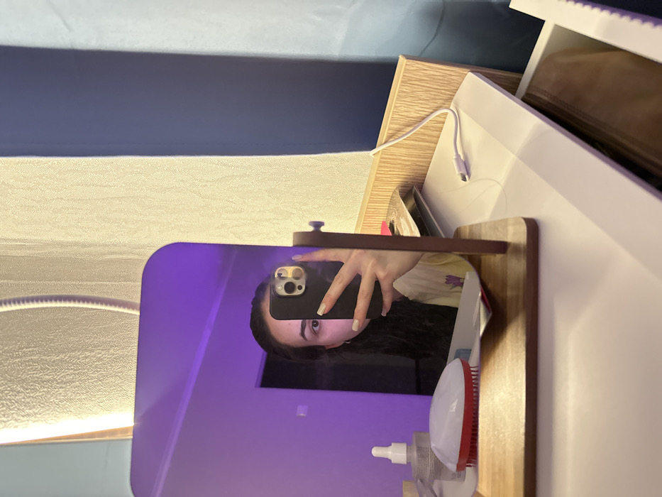 An indoor scene within a room in Trudovaya, Russia, depicts a selfie being taken in a standing vanity mirror. **People:** A female individual is partially visible in the mirror's reflection. Her right eye, eyebrow, and a portion of her forehead are discernible, along with dark hair. Her right hand, holding a dark-colored smartphone, is positioned centrally, exhibiting manicured nails with a light, possibly white, polish. She wears a light-colored garment, potentially yellow, with a faint purple design. **Objects and Environment:** A rectangular mirror with rounded corners, set in a dark wooden frame and base, stands on a white desk or vanity surface. The mirror's reflection is cast with a prominent purple hue, indicating ambient lighting in the reflected space. The smartphone held by the individual features a triple-lens camera system on its rear. On the white desk surface to the left of the mirror, a clear bottle with a white dropper or pump cap and a white and red hairbrush are present. To the right, a white USB-C charging cable lies unplugged. Behind the mirror, a stack of items, possibly papers or thin books, is visible against a light-colored wooden panel. The desk itself is white, and a partially open white drawer is visible below it on the right. The background wall outside the mirror's reflection features a textured, light beige wallpaper. To the far right, a section of wall is painted a solid dark blue. A vertical light source, emitting a warm light, is partially visible and reflected in the upper left of the mirror. A coiled white cable is also present in the upper left background. The room reflected in the mirror has dark, indistinct areas, possibly a doorway.