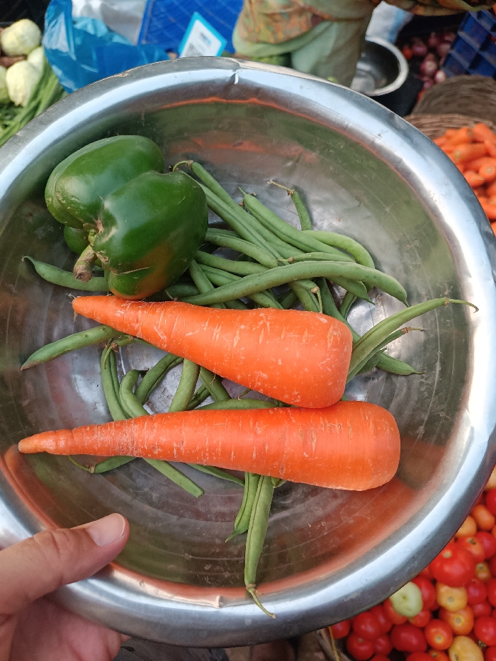 In Enumulapalli, India, an overhead shot captures a metallic bowl held by a human hand at what appears to be a market stall. The bowl contains two green bell peppers, numerous green beans, and two orange carrots. The visible thumb of a light-skinned hand grips the lower-left rim of the bowl. In the background, out of focus, a blue plastic bag featuring a QR code is visible. To the right, blurred piles of red tomatoes and other produce are present, with a person partially visible behind them.
