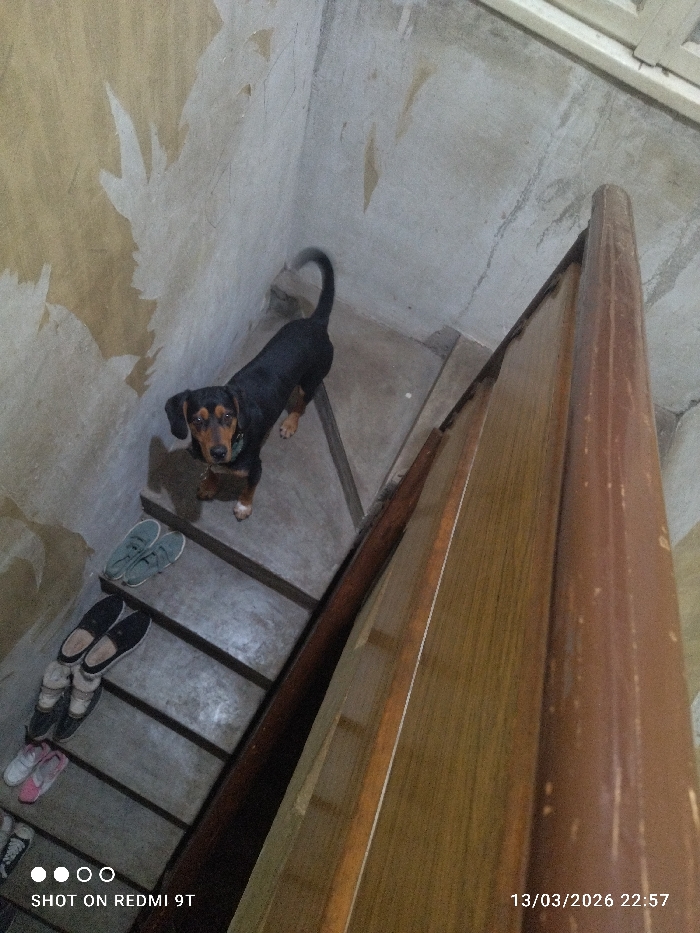 An indoor, narrow staircase is depicted within the city of Unknown, Unknown. A black and tan short-haired dog, wearing a green collar, stands on an upper step or landing, looking directly towards the camera. Its tail exhibits motion blur. The staircase steps are grey. Several pairs of shoes are arranged on the lower steps: a pair of teal flat shoes, a pair of black flat shoes, a pair of pink ballet flats, and a pair of black and white sneakers. The adjacent walls are light-colored, showing extensive areas of peeling paint or wallpaper and visible cracks in the plaster. A dark brown wooden handrail runs along the right side of the staircase.