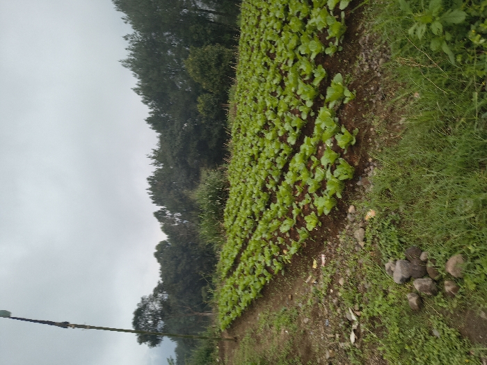 Rows of green leafy plants cover the cultivated field. Trees line the edge of the field against a cloudy sky. The ground is a mix of soil and green vegetation. Rocks and loose soil are scattered around the field. A tall pole structure is visible near the bottom-left corner.