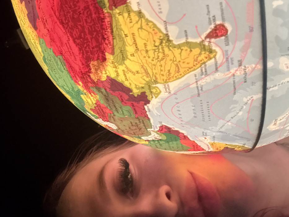 A close-up image shows a female individual positioned to the left of a large, illuminated globe