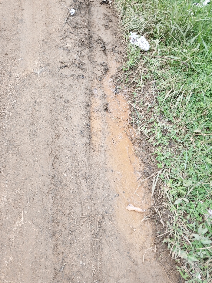 The image depicts an unpaved dirt path bordering a vegetated verge in Thotagamuwa, Sri Lanka, observed from an overhead perspective. The path, light brown in color, displays multiple parallel tire impressions and scattered dry organic debris. Adjacent to the path, a distinct strip of darker, wet mud with standing water forms the transition to the verge. This verge consists of unkempt green grass and various herbaceous plants, containing several pieces of white, crumpled refuse dispersed throughout. An elongated, pale object, possibly biological in origin, rests partially submerged in the muddy water at the lower right edge of the path. No individuals, animals, or active interactions are present within the frame.