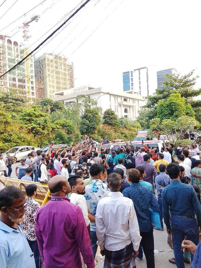 A dense crowd of approximately 100-150 individuals, primarily adult males, is gathered on a paved street or open area. The location is near the Dhaka Metropolitan Police Headquarters on Abdul Gani Road, Ramna, Dhaka, Bangladesh, identifiable by the distinctive white institutional building with an arched entrance visible in the mid-background. In the foreground and mid-ground, numerous individuals are visible from various angles. Many in the central portion of the crowd are holding smartphones or cameras above their heads, pointing towards a focal point obscured by the crowd's density. One white van with a red light bar on its roof is partially visible within the cluster of people. Several cars are parked or moving on a road further behind the main crowd. The background features a mix of urban architecture and greenery. To the left, multiple multi-story buildings are under construction, with visible scaffolding and a tower crane extending skyward. In the center-right, the prominent white building of the Dhaka Metropolitan Police Headquarters stands. Further to the right, modern glass-fronted high-rise buildings are visible. Lush green trees and foliage are dispersed between the buildings and along the roadside. Overhead power or communication lines crisscross the upper portion of the frame against a bright, overcast sky. A yellow barricade or fence is partially visible in the lower-left foreground. The scene depicts a public gathering in a busy urban setting during daylight hours.