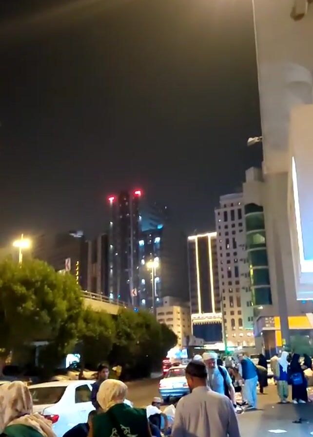 At night, a group of people are gathered on a city street near parked cars. Most of the people are dressed in traditional Islamic clothing. Some wear green vests with "Yüksel" printed on the back. They seem to be preparing or distributing items, possibly food or supplies. The street is well-lit with streetlights, and tall buildings with illuminated windows dominate the background. A building with two glowing red lights on top is visible in the center. The atmosphere seems calm and orderly.