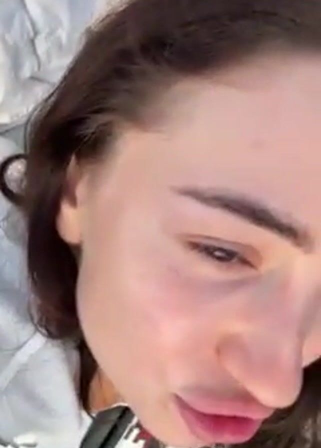 Two women are taking a selfie video outdoors. The woman closest to the camera has long, dark brown hair and is wearing a light grey hooded sweatshirt. She is smiling and talking, and the camera is shaky. Behind her is another woman with brown hair and a light-colored jacket. They are facing the camera and the background shows a grassy hillside, a green SUV parked on the incline, and a blue sky.
