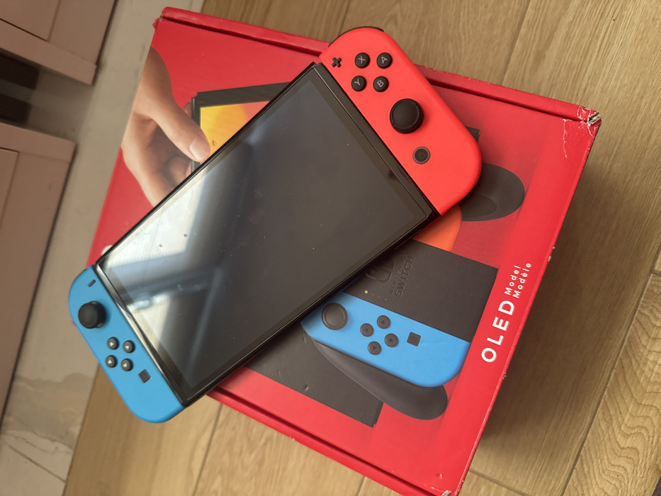 The scene is located in Sevlievo, Bulgaria. A Nintendo Switch OLED gaming console is positioned diagonally atop its red retail packaging box. The console's screen is dark, unilluminated, and exhibits multiple small, circular smudges and reflections. A blue Joy-Con, equipped with a black joystick and four black directional buttons, is attached to the left side of the console. A red Joy-Con, featuring a black joystick, four black action buttons (A, B, X, Y), a plus button, and a home button, is attached to the right side. The red retail box displays "OLED Model" and "Modèle" text at the bottom. Graphics on the box include an image of a blue Joy-Con attached to a console and a human hand holding a console in the upper right. The box shows minor damage, including a crease or small tear on its bottom-right corner. The console and box rest on a light brown wooden or laminate floor. The background consists of out-of-focus, light-colored furniture components, possibly cabinet doors. No individuals are present in the image.
