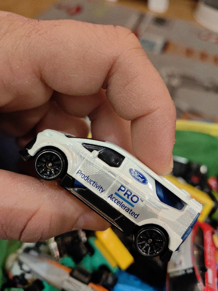 - "A close-up image displays a human hand holding a white die-cast toy van, identified as a Ford Transit Custom model" by FM-AyYj03, licensed under CC BY 4.0