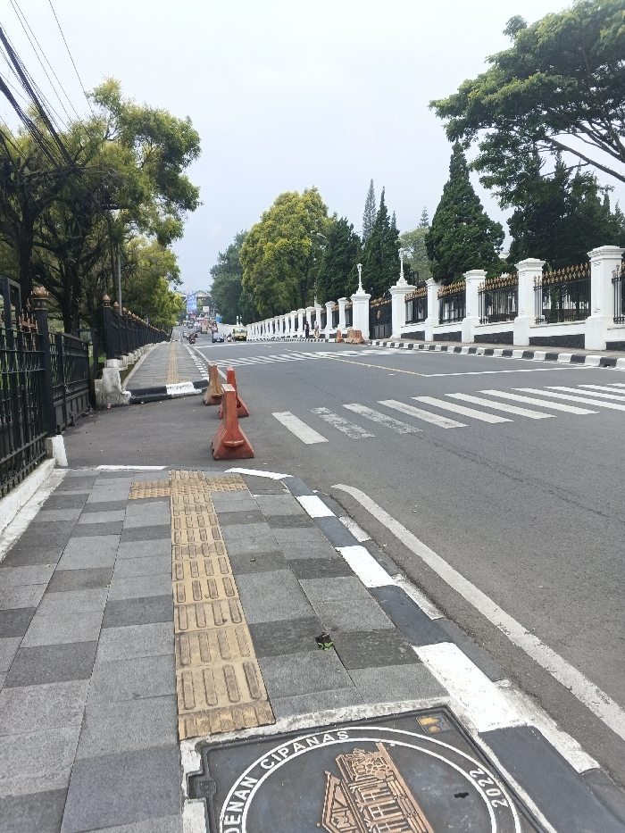 The image displays an urban street scene under an overcast sky. In the immediate foreground, a grey tiled sidewalk features a section of yellow tactile paving. A black circular manhole cover is embedded in the sidewalk, inscribed with "DENAN CIPANAS 2022" and an architectural rendering of a building. To the right of the sidewalk is an asphalt road with a white painted curb, a solid white line, and a broken white center line. A pedestrian zebra crossing is marked on the road surface. Three orange plastic traffic barriers are positioned near the curb between the sidewalk and the road. On the left side of the road, a dark metal fence runs alongside a wide sidewalk bordered by numerous trees with dense green foliage, with power lines visible overhead. On the right side of the road, an elaborate white fence with ornate pillars and black and gold metal sections encloses a property, behind which stand large green trees, including both conifers and broadleaf varieties. Further down the road, vehicles including cars and motorcycles are visible, moving away from the viewer. The road appears to gently slope downwards into the distance.