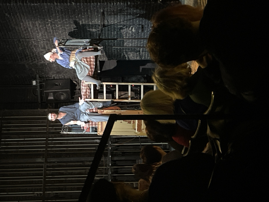 The image depicts a theatrical performance occurring in a dimly lit venue, likely a theater in Moscow, Russia. The specific address or name of the venue is not discernible from the provided visual information. On stage, two adult male actors are positioned on elevated platforms. The actor on the left is seated on a lower, light-colored wooden platform with a partially peeling surface, facing towards the audience. He has a beard and short dark hair, wearing a dark blue or gray long-sleeved shirt with a noticeable tear on the left sleeve, and gray trousers. His hands are open and extended forward, palms upward, in a gestural posture. To his right, a second male actor is seated on a higher, bunk-bed-like structure with a light wooden frame and a ladder leading up to it. This actor, with a bald or shaved head covered by a white fabric cap or headwrap, is dressed in a blue tunic, a light-colored checkered wrap or garment over his legs, and dark leggings. He faces left, towards the first actor, with his left arm resting on the bed frame. The stage background features a dark brick wall on the right and a tall, dark metal structure resembling scaffolding or prison bars on the left. A dark speaker unit is mounted on the brick wall between the two platforms. In the foreground, the backs of approximately eight to ten audience members are visible in deep shadow, seated in rows, observing the performance on stage. The environment is characterized by dramatic stage lighting, illuminating the performers and set pieces while keeping the audience area in obscurity.