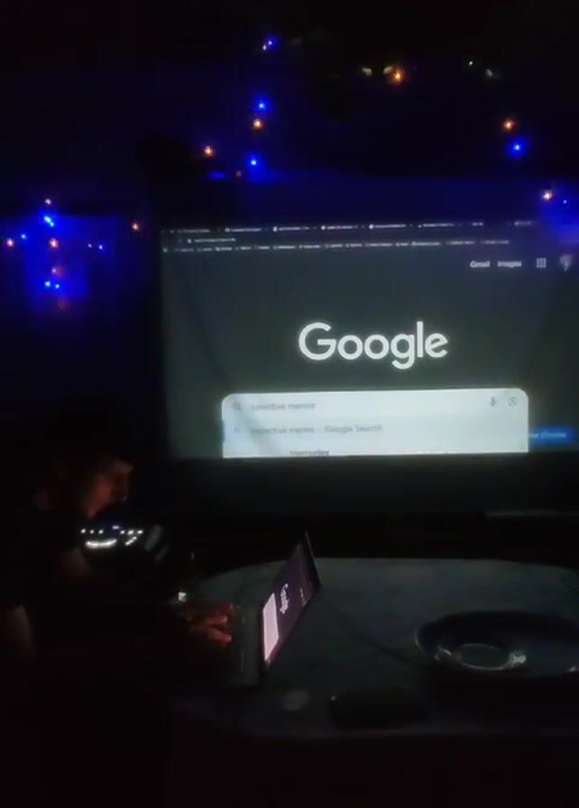 A person is using a laptop in a dark room with multi-colored Christmas lights strung around the ceiling. A Google search for "collective memory" is displayed on a screen, projected on the wall behind them. There is a table in front of the person, on which sits the laptop, a mouse, and a plate. The person is actively typing on the laptop.