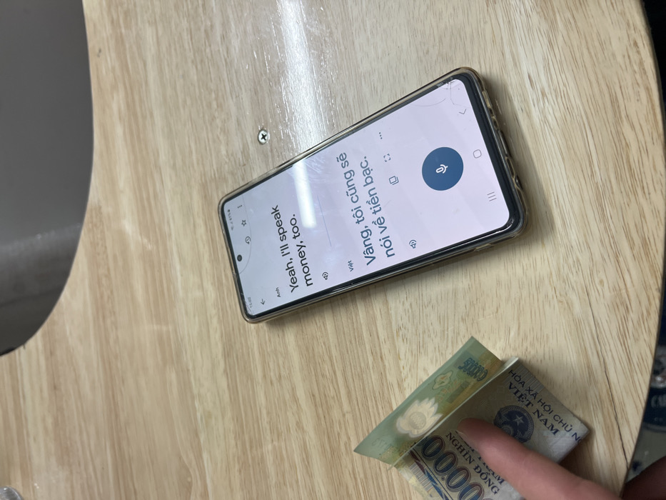 The scene depicts a close-up, elevated view of a light-colored wooden table surface within an unspecified indoor location in Thủ Đức, Vietnam. A human left hand, specifically the thumb and index finger, holds a folded Vietnamese 50,000 Dong banknote in the lower-left quadrant. The visible side of the banknote displays "50000 NGHÌN ĐỒNG" and "HÒA XÃ HỘI CHỦ NGHĨA VIỆT NAM." Adjacent to the money, a dark-colored smartphone, enclosed in a clear, cracked protective case, rests horizontally on the table. The phone screen displays a translation application (likely Google Translate), showing "Yeah, I'll speak money, too." in English and "Vâng, tôi cũng sẽ nói về tiền bạc." in Vietnamese. A microphone icon is centered below the translated text. The phone's status bar indicates the time as 15:02, with Wi-Fi and mobile signal icons present. A single Phillips head screw is visible embedded in the wooden surface to the right of the phone. A dark, circular object or surface is partially visible in the upper-right background.