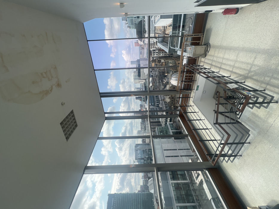 An interior view from a high vantage point shows a large window revealing a cityscape under a sky with scattered clouds. Sunlight streams in, reflecting off the glass. A modern staircase with a metal and wood railing leads down. There are water stains on the ceiling and an air vent. A wheeled cart sits near the edge of the floor. A fire extinguisher is also mounted on the wall.