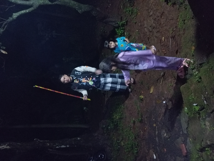 This image depicts an outdoor night scene in Bulukandang, Indonesia. Three individuals are present, illuminated by an artificial light source in what appears to be a wooded or semi-wooded area with dark soil ground cover and visible tree trunks. In the background-center, an adult male stands facing forward, wearing a black graphic t-shirt, a black and white letterman jacket, and a black and white checkered sarong. He holds a long, slender stick, patterned with red and yellow tape, vertically in his right hand. A dark-colored motorcycle wheel is partially visible behind a tree trunk on the far left. In the foreground, an older child, a girl with long dark hair, stands slightly to the right, wearing light purple pajamas and pink sandals. She is looking downwards and extending her right arm forward, pointing towards a small, glowing object on the ground directly in front of her. This object emits a white-yellow light and a wisp of smoke, indicative of a lit firecracker or sparkler. Adjacent to her feet and further left are dark, moss-covered stones and fragments of red brick. Behind and to the right of the older girl, a younger child, a girl with dark hair, stands facing forward, wearing a light blue top and patterned bottoms. She looks towards the camera. The background beyond the individuals is uniformly dark, offering no discernible details.