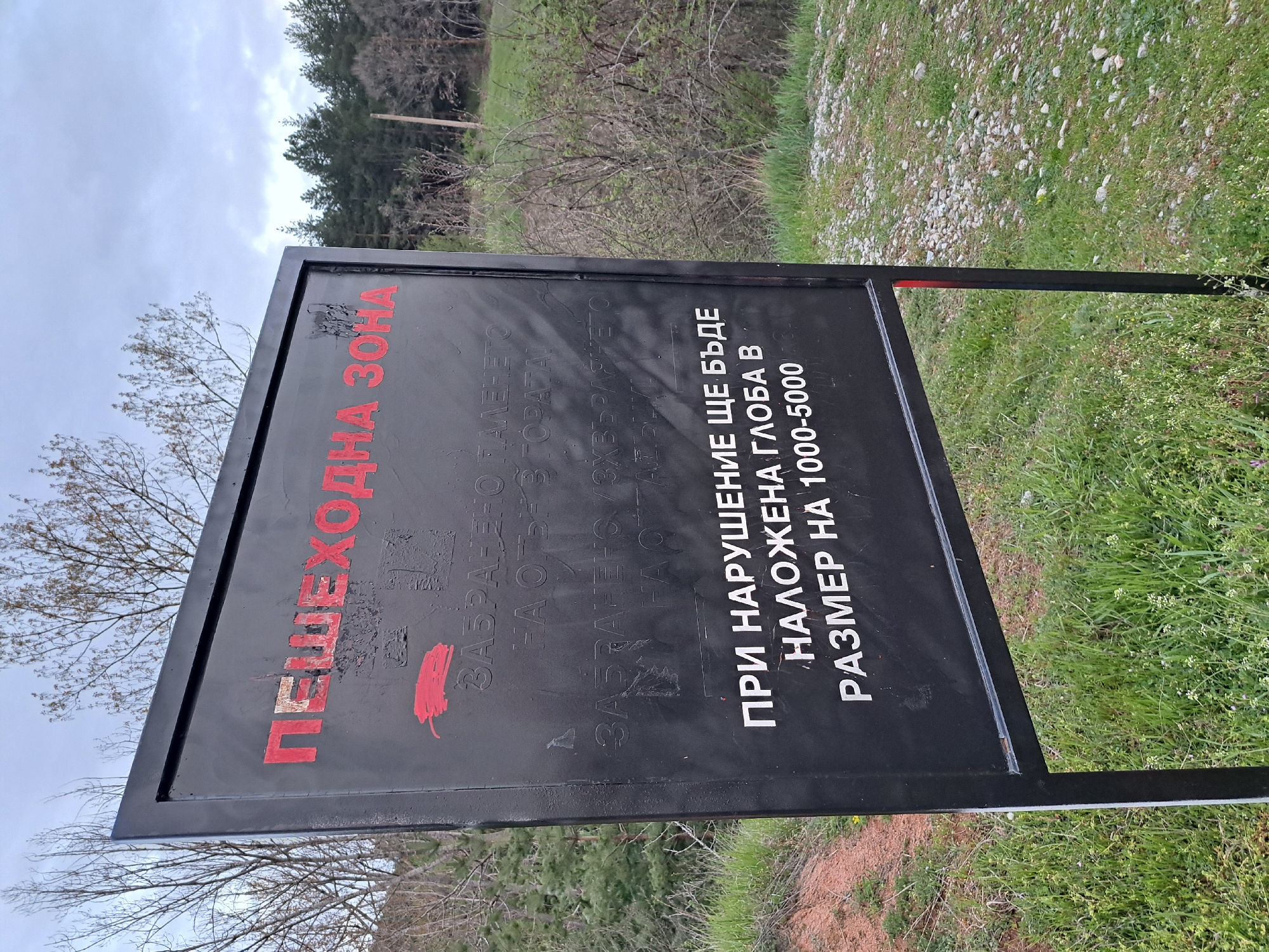 The image depicts a black rectangular sign with red and white lettering, leaning slightly to the right. It's situated in a natural, outdoor environment with greenery and gravel visible on the ground. Behind the sign, there are trees and bushes, suggesting a forested or rural location. The sign itself has text written in Bulgarian, which translates to "Pedestrian Zone" and warns against starting fires, dumping trash, and incurring fines from 1000 to 5000. The photo's location is Lokorsko, Bulgaria.