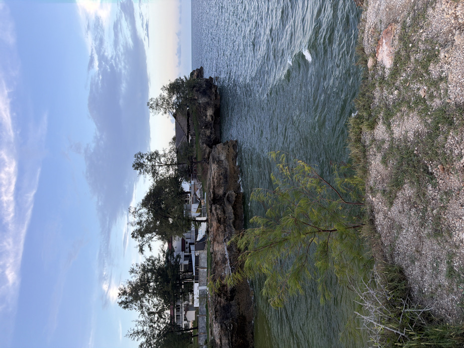 The image displays a coastal scene within the city of Dar es-Salaam, Tanzania, characterized by rocky cliffs and ocean water under a partially cloudy sky. The foreground consists of dry, gravelly soil with sparse green and dry vegetation, including a prominent light-green shrub with thin branches positioned centrally on the left. The midground features dark-colored, rugged rock cliffs that descend into an inlet or bay. The water within the bay exhibits a greenish-blue hue and transitions to a deeper blue towards the open ocean on the right. Small waves and whitecaps are visible on the water's surface. In the background, positioned atop the cliffs, are several structures interspersed among tall, dark green trees. To the left, multiple light-colored, multi-story buildings are visible, appearing to be part of a larger complex, with a white fence running along their base. To the right, a distinct structure with a dark, thatched roof stands on a separate cliff point, also surrounded by trees. The sky occupies the upper portion of the frame, displaying a light blue color with scattered white and light-grey clouds of varying formations. No individuals or specific actions are discernible.