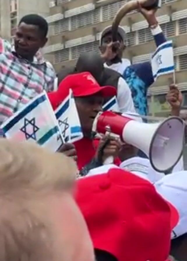 rally supporting Israel. A man in a red shirt and hat holds a megaphone, addressing the crowd. He's also holding an Israeli flag, and others in the crowd hold flags as well. A man in the background holds a shofar aloft. The rally is taking place in a city environment. A building with a distinctive pattern of horizontal lines is visible in the background.