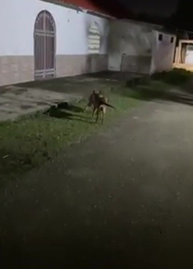 At night, two brown dogs on a grass patch on the side of a road stand facing each other