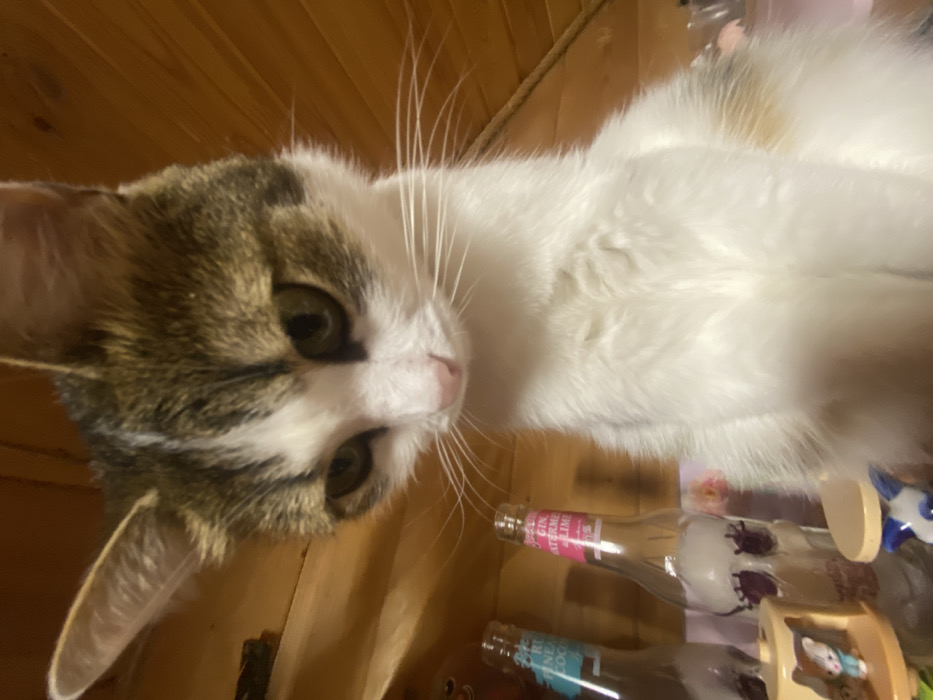 - "A domestic cat, predominantly white with tabby markings on its head, ears, and patches on its back, is positioned centrally in the frame, looking downward with a pink nose and dark-olive eyes" by FM-tUrX33, licensed under CC BY 4.0