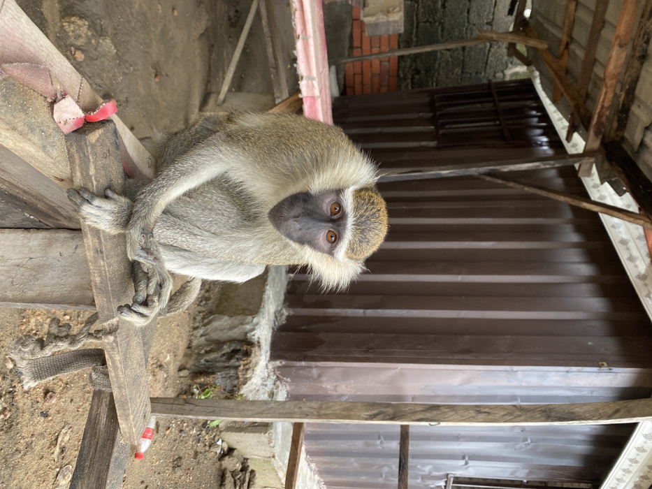 The image displays a vervet monkey (Chlorocebus pygerythrus) seated prominently in the center, facing the viewer directly. The monkey possesses greyish-green fur on its body, a dark grey face, and distinctive amber-orange eyes. Its front limbs are crossed and rest on its knees while it sits upright on a rough, unpainted wooden bench or frame. The immediate foreground comprises bare earth scattered with small debris. To the right of the wooden structure, a red and white plastic bottle is visible on the ground. A red fabric strap is attached to the wooden frame on the left. In the mid-ground, a dilapidated wooden table with a red and white striped surface is partially visible to the left of the monkey. Behind this, a wall constructed from grey concrete blocks and some exposed red bricks forms part of the background. On the right, a dark brown corrugated metal building, supported by a concrete foundation, features a horizontal, unglazed window opening on its right side. An exposed, crude wooden roof structure, with visible rafters and a light-colored, possibly corrugated, covering detailed with a white decorative trim, spans the upper portion of the scene. A thick, dark wooden post stands vertically on the far right, supporting the overhead structure. This scene is located in Lokoja, Nigeria.