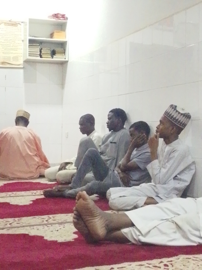 Five men sit on a red and beige patterned carpet in a room with white tiled walls. One man faces away from the camera, wearing a peach-colored robe and a cream-colored hat. The other four men face to the right, wearing various shirts and pants. The last man on the right wears a light-colored hat. A small white shelf with books sits in the upper left corner.