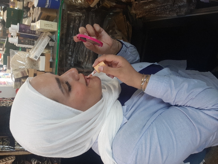 A female subject, wearing a white hijab and a light blue long-sleeved button-up shirt over a darker garment, is observed in Barza Municipality, Syria. She is actively applying a light-colored lip gloss to her lips using an applicator held in her right hand. Simultaneously, she holds a small, pink-framed compact mirror in her left hand, directed towards her face. Gold-toned bangles are visible on her right wrist. The background features a commercial display area, specifically a shelf with a green trim, filled with various retail products. These items include multiple bottles of liquid cosmetics or personal care products, numerous small packaged boxes, a clear plastic bag containing a fibrous object (possibly a loofah or sponge), and a blue and white container partially labeled "Sham." The overall scene is indoors, well-lit, suggesting a shop or market stall.