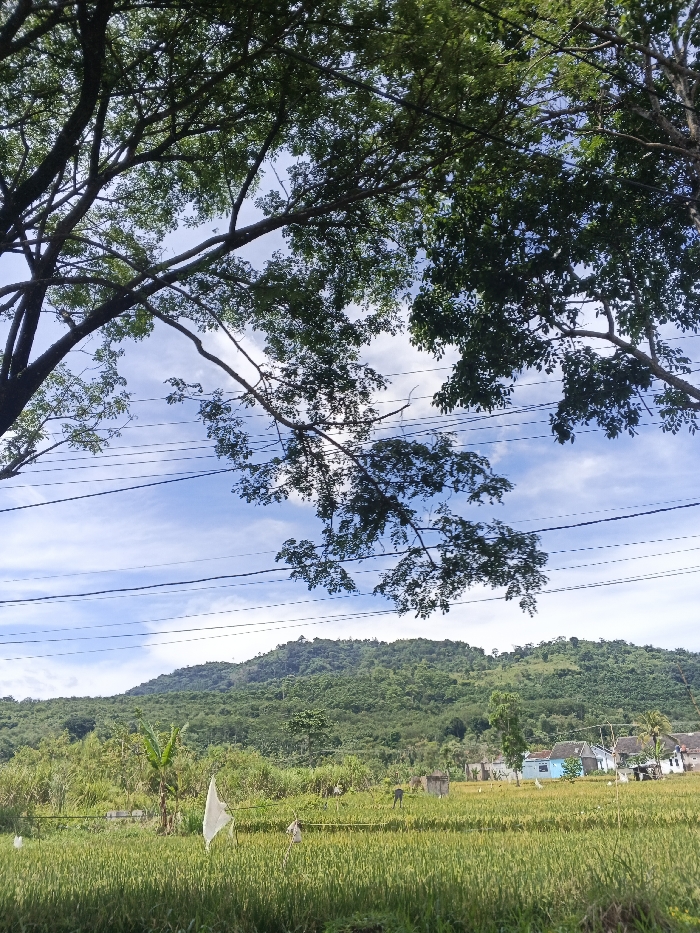 A scenic view presents a rice paddy field in the foreground, transitioning to a vibrant green landscape. A mountain rises in the distance, its slopes covered with dense trees. Power lines stretch across the sky, partially obscured by the branches and leaves of trees in the top half of the view. Scattered houses sit on the outskirts of the rice field, their presence hinting at a human presence near the natural environment.