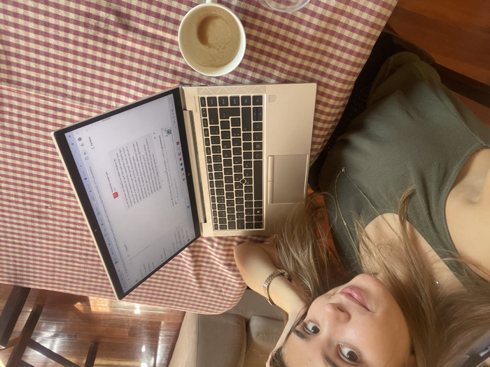 This image depicts an indoor scene in the city of Aldoar, Foz do Douro e Nevogilde, Portugal. A young adult female, with light brown hair and complexion, wearing a green ribbed tank top and a gold-colored necklace, is positioned on the left, looking directly at the camera with a slight smile. Her left arm is raised, with her hand resting near her head. A silver-colored bracelet is visible on her left wrist. In the foreground, a light-colored (possibly rose gold) laptop is open on a table covered with a red and white checkered tablecloth. The laptop screen displays a document or webpage with visible text and graphical elements, including a red icon on the top right portion of the displayed content. To the right of the laptop, a white ceramic mug, containing residual light brown liquid, rests on the tablecloth. A clear plastic cup or glass is partially visible below the mug. The background, out of focus, shows a light-colored couch on the left and dark wooden furniture legs on the right, above a polished hardwood floor. The scene is brightly illuminated, indicating natural light.