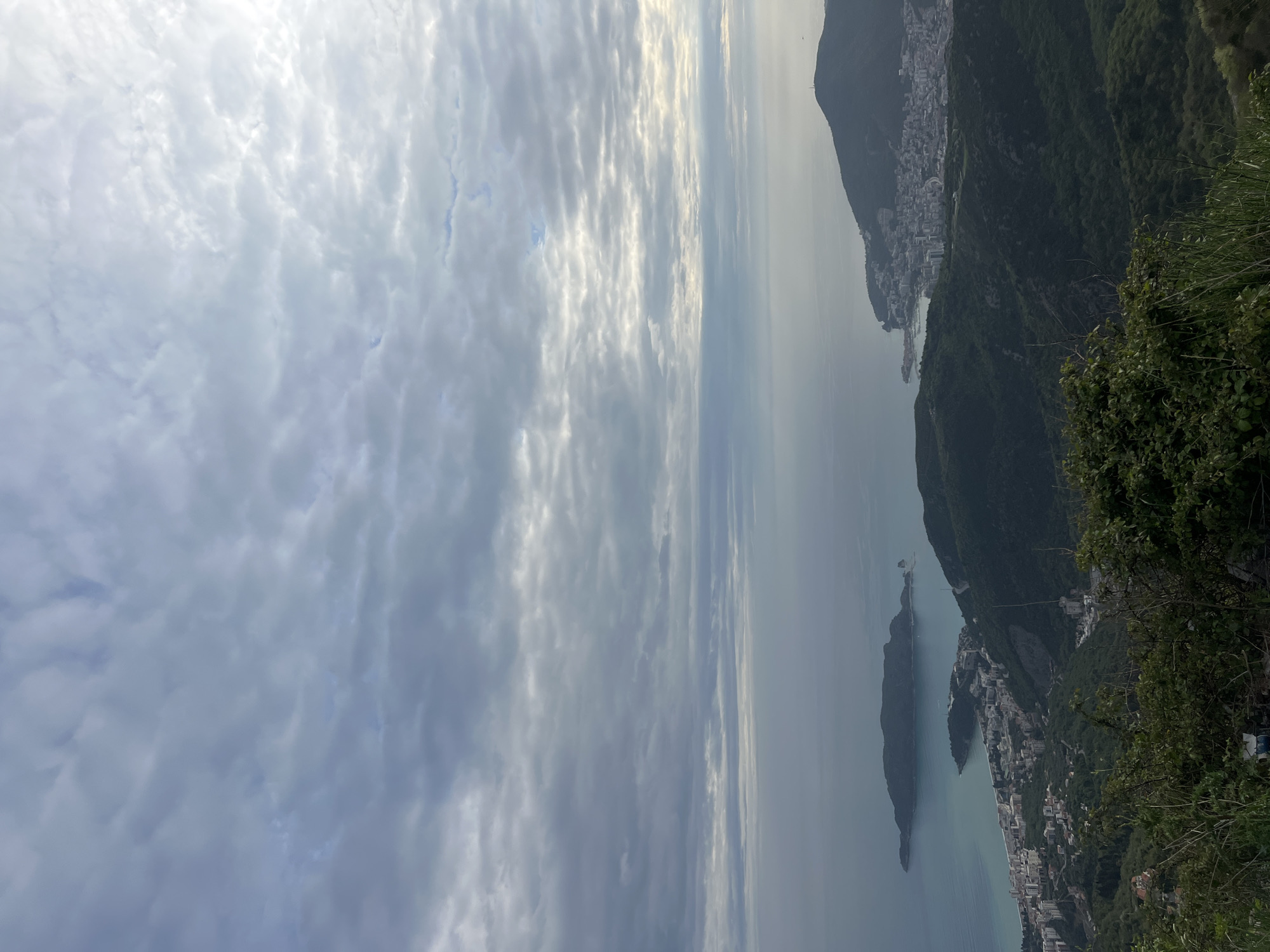 The image presents a high-angle view of the coastline near Brajici, Montenegro. A cloudy sky occupies the left portion of the frame. The Adriatic Sea is visible towards the center, with landmasses and islands extending into it. The topography suggests a rugged, mountainous terrain, with dense vegetation covering the slopes. A coastal city is situated at the base of the mountains, with buildings and infrastructure visible. The foreground of the image is partially obscured by greenery, indicating that the viewpoint is from a high vantage point, potentially a mountain or cliff.
