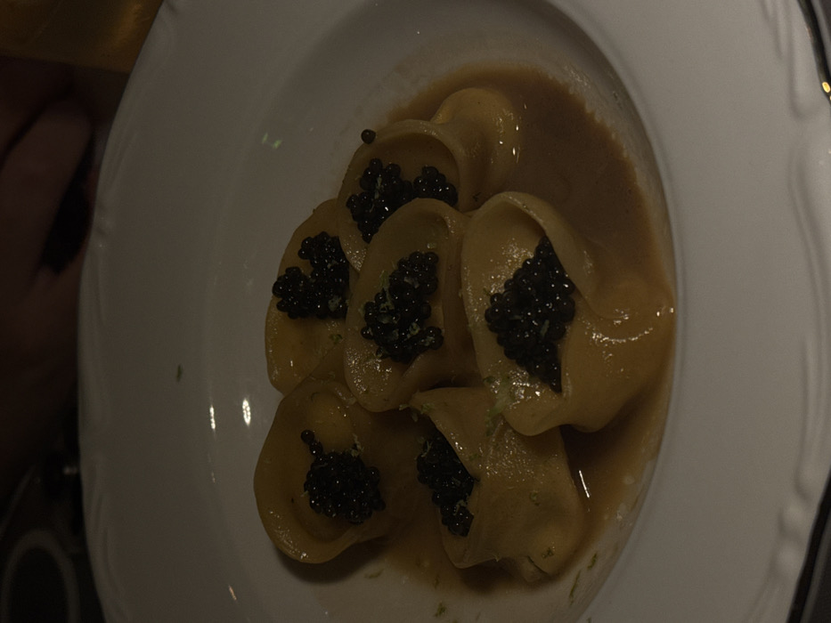 A close-up shows a white bowl filled with pasta shells. Each shell is generously topped with black caviar. A light brown sauce lightly coats the pasta and gathers in the bottom of the bowl. Bits of green garnish are sprinkled around the dish. The image is dimly lit, creating a warm and muted tone. The rim of the bowl is visible, showing a slight decorative pattern.