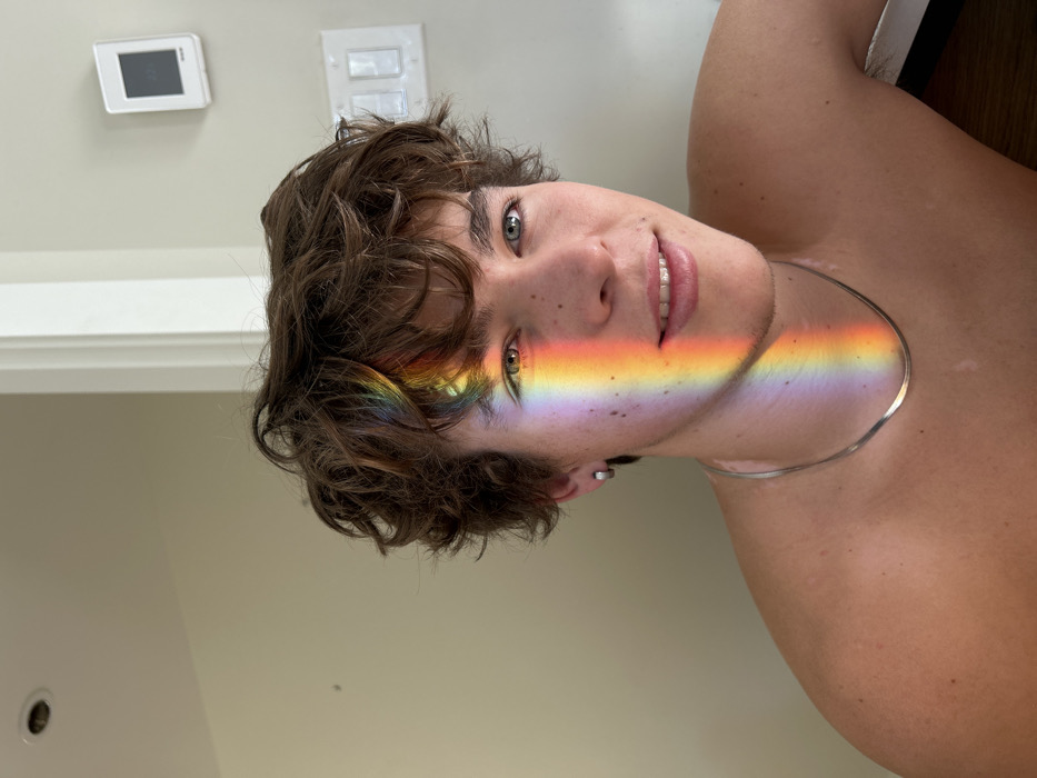 The image depicts an indoor scene in Squamish, Canada, featuring a male individual from the mid-chest up. He possesses medium-length, curly brown hair, light-colored eyes (appearing hazel in the right and blue/green in the left), and visible freckles across his nose and cheeks. A silver hoop earring is present in his left ear, and he wears a thin silver chain necklace. His upper body is bare, revealing a light-toned skin complexion and a faint scar or mark on his upper left chest/shoulder area. A prominent, vertical band of rainbow light spans across his face, originating near his forehead, passing through his right eye, across his cheek, and ending below his mouth. The spectrum of colors, from red at the bottom to violet at the top, is clearly visible within this band. The individual is looking forward, displaying a subtle, closed-mouth smile. The background consists of a plain, light-colored wall. A white door frame is partially visible on the left side. On the right, a white wall-mounted digital thermostat, displaying "44", is present above a standard white electrical light switch panel with multiple toggle switches. A recessed light fixture is visible on the ceiling in the upper left portion of the image. The lighting is bright and even.