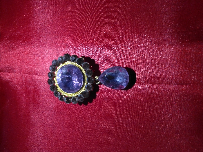 An ornamental jewelry piece is displayed centrally on a deep red, slightly creased fabric, likely satin or velvet. The jewelry comprises an upper, oval-shaped component and a lower, pear-shaped drop. The oval component features a large, faceted, light purple stone, possibly amethyst, set within a golden-toned bezel. Encircling this bezel are approximately twenty-two smaller, dark, round stones or beads. A dark-colored link connects the oval component to the suspended, faceted, pear-shaped light purple stone. The lighting casts a soft shadow beneath the jewelry. No individuals, actions, or interactions are depicted. The precise location within Pilsen, Czechia, is not discernible from the visual information provided.