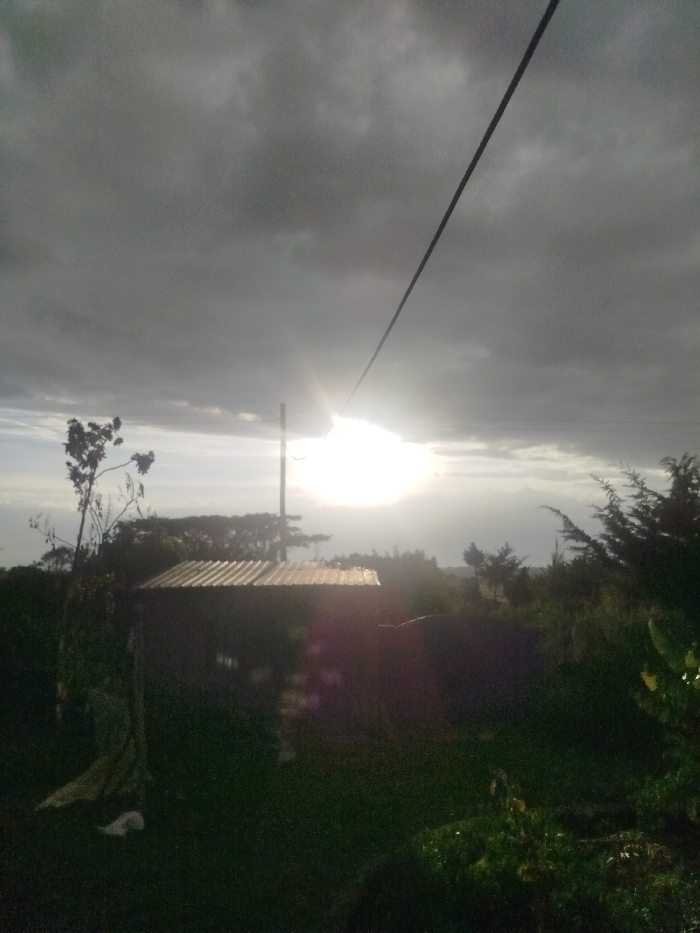 The image displays an outdoor scene in Naivasha East ward, Kenya, characterized by an overcast sky and direct sunlight. Dark grey clouds dominate the upper sky, while the sun appears as an intense, brilliant white light source breaking through a lighter, hazy band of clouds along the horizon, producing significant glare and lens flare. In the midground, a darkened structure with a corrugated metal roof is visible to the left of the sun, largely in silhouette. A wooden utility pole stands vertically to the right of the sun. A single dark cable extends diagonally from the upper-center towards the bottom-right of the frame, passing directly through the sun's glare. Dense green vegetation, including various trees and shrubs, occupies the foreground and midground, with taller trees on the left and conifer-like foliage on the right. Distant landforms or hills are faintly discernible in the far background beneath the lighter sky. No individuals are present in the scene. The lighting conditions suggest either sunrise or sunset.