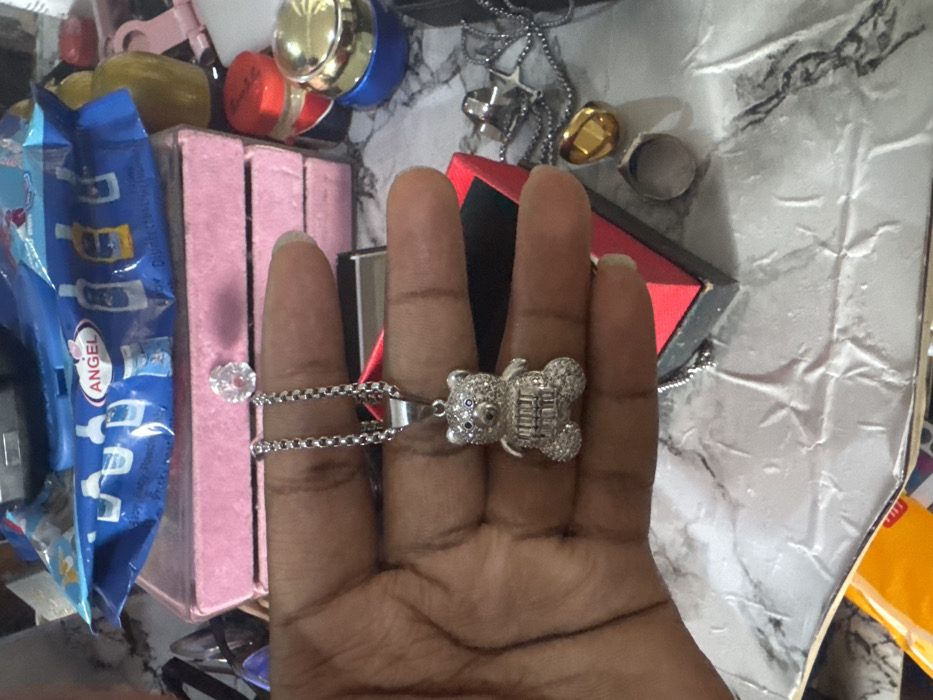 A dark-skinned hand holds a silver-colored necklace with a bear-shaped pendant in the city of Asipa, Nigeria. The pendant is extensively embellished with clear, simulated diamonds, featuring both small round stones and horizontal baguette-cut stones across the bear's chest. A single larger clear stone is visible at the apex of the chain. The background is a shallow depth of field, revealing a cluttered surface. Objects visible include a blue "ANGEL" brand disinfectant wipes package, stacked pink rectangular boxes, various small containers (red-capped, blue with gold lid, gold-colored), and an open red and black box. Several other pieces of jewelry, including a star-shaped ring, a gold-colored ring, a plain silver-colored ring, and silver chains, are scattered on a light-colored, textured surface resembling marbled paper or a tablecloth. The scene is indoors, likely a personal or retail display setting.
