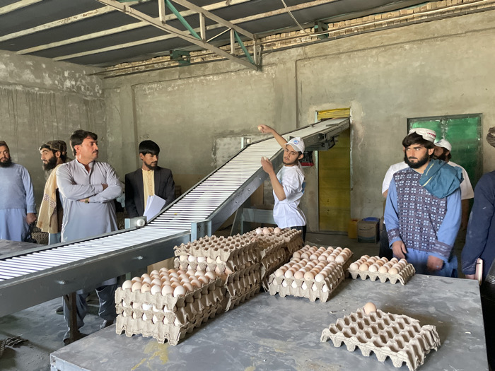 An indoor scene depicts an egg processing facility in Shuyene Vosta, Afghanistan