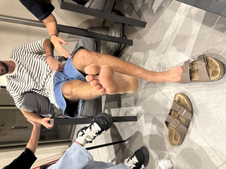An indoor scene in Givat Shmuel, Israel, depicts three individuals engaged in a casual interaction. A male subject, seated center, wears a horizontal striped t-shirt and denim shorts. His right leg is extended forward, with his bare foot visible closest to the camera. His left foot is partially in a brown Birkenstock sandal, while the matching sandal rests on the light grey tiled floor nearby. To his left, a female subject, partially visible, wears light blue jeans and black chunky sneakers with white laces. Her right arm extends to touch the male's left forearm. To the male's right, a second female subject, also partially visible, wears a dark top, with her left hand resting near the armrest of the male's chair. A clear glass containing a crumpled white napkin is on the floor to the left. The background features a light-colored wall and a glass door or window. All individuals are seated in modern chairs with dark frames and grey cushions.