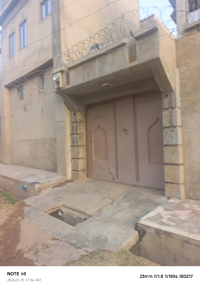 A two-story building with a gate and barbed wire on top. The gate is light brown and framed by concrete columns. The building's exterior is concrete, showing wear and age. A rectangular opening in the concrete pavement leads down, potentially to a drainage or utility access point. The image is taken at ground level, focusing on the gate and immediate surroundings.