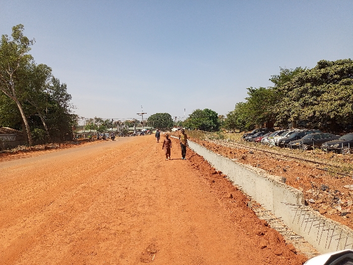 An outdoor scene in Barnawa, Nigeria, is depicted under clear blue skies. The foreground and midground are dominated by a wide, unpaved road of red-orange earth. On the left side, the road transitions to a partially paved section in the midground, where multiple motorcycles are parked alongside a low wall and dense green trees. Buildings are visible in the far background. On the right side of the unpaved road, a newly constructed concrete barrier or drainage channel extends into the distance, with exposed rebar indicating ongoing work or recent completion. Beyond this barrier, parallel railway tracks are discernible, bordered by a long row of approximately 10-15 parked passenger vehicles (sedans) beneath a canopy of large green trees. Three individuals are walking from the mid-foreground towards the background on the unpaved road; two are dressed in earth-toned clothing, and one in lighter attire. Another individual in a light brown top and dark trousers walks parallel to the concrete barrier on the right side, heading away from the camera. Additional individuals are visible in the mid-background near the parked motorcycles. The scene suggests a dry, sunny day with active human presence and ongoing infrastructure development.