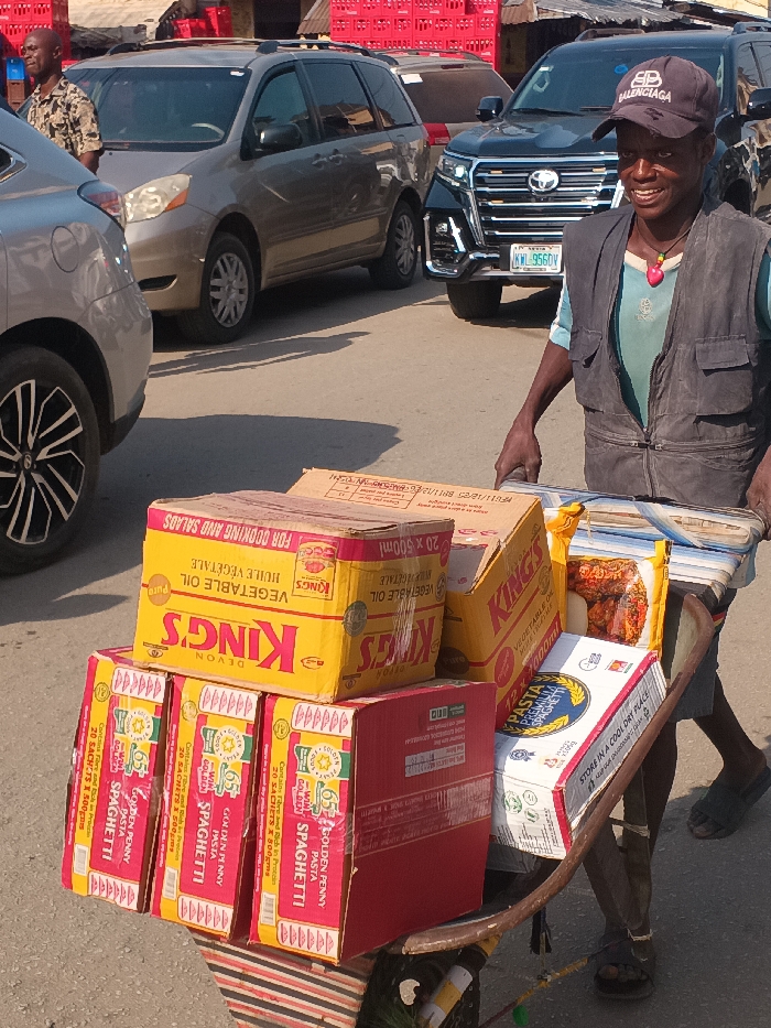 A man wearing a "Balenciaga" cap and vest is pushing a cart loaded with various food items. There are multiple boxes of "Golden Penny" spaghetti and "King's" vegetable oil stacked on the cart. Other visible products include pasta in a white box and a bag of noodles. The setting appears to be an outdoor market or street with cars and a red crate stacked in the background. A man is standing behind the gray car.