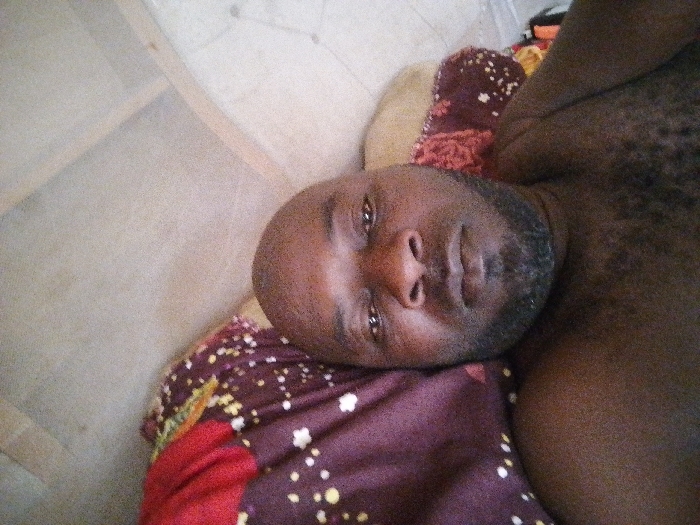 An adult male with dark skin and a short dark beard lies horizontally, looking directly into the camera