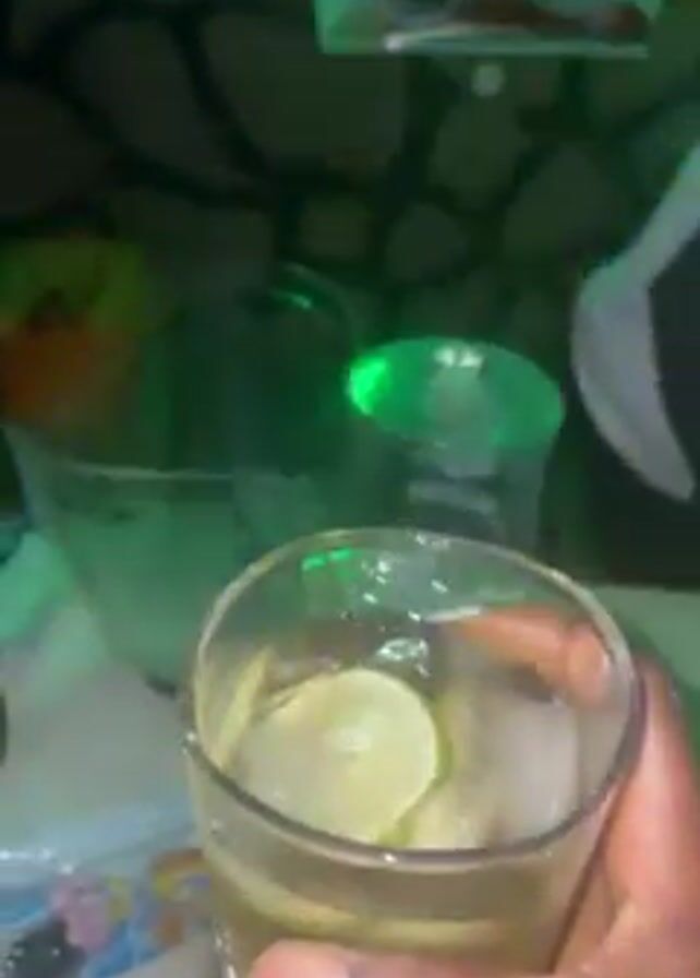 A close-up shot shows a dark-skinned hand holding a glass filled with a light-colored liquid, ice, and lime slices. The glass is positioned in front of a table with multiple containers, potentially ice buckets, illuminated with changing colors of blue, green, and pink. In the background, a person in a white shirt is partially visible, and a decorative wall with a patterned design is seen behind them. The lighting in the environment appears dim, emphasizing the colorful illumination of the ice containers.