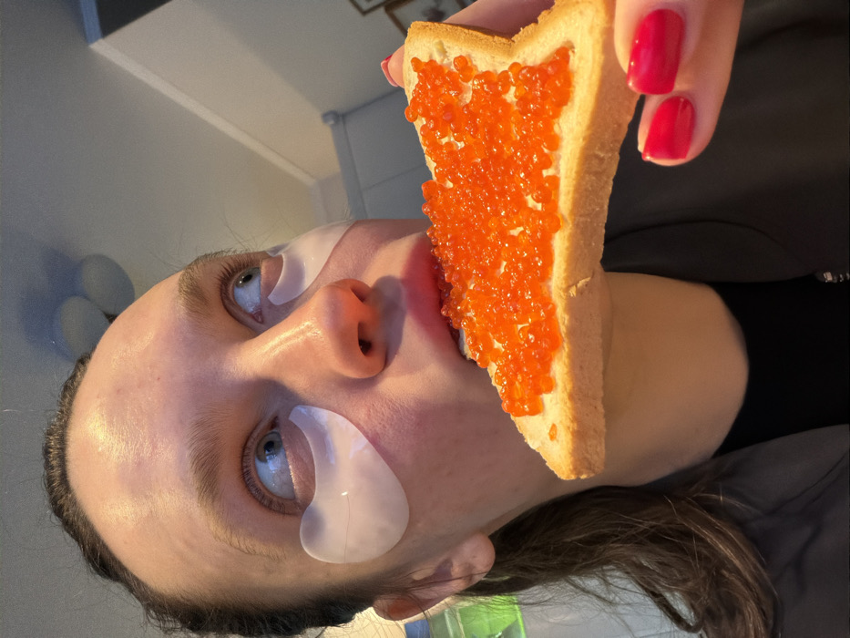 A woman with fair skin and eye patches holds a triangle-shaped piece of toast covered in bright orange caviar near her mouth