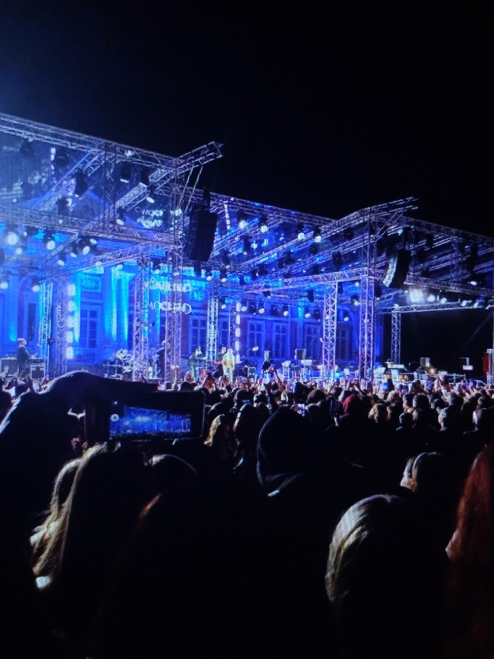 An outdoor night event is depicted, likely a concert or public gathering, set against a backdrop of the University of Dodoma (Chuo Kikuu Dodoma) campus in Dodoma, Tanzania. The location is inferred from the text "CHUO" and "ACCESSO," consistent with "CHUO KIKUU DODOMA" visible on the illuminated architectural structure serving as the stage background. The scene is dominated by a brightly lit stage constructed with a robust metal truss system supporting multiple arrays of blue and white stage lights, spotlights, and large speaker systems positioned on either side. Behind the performance area, a multi-story building featuring classical architectural elements such as columns and arched windows is intensely illuminated with blue light. On stage, several individuals are visible, including what appear to be performers and possibly crew members. One central figure, dressed in a light-colored outfit, is prominent. Musical instruments and audio equipment are arranged across the stage platform. In the foreground and midground, a dense crowd of people occupies the lower half of the image, facing the stage. Most individuals are silhouetted against the powerful stage illumination. Numerous audience members have their hands raised in the air. A person in the immediate foreground is holding a smartphone horizontally, recording the event, with the screen displaying a reflection of the blue stage lights. The ambient environment is dark night sky above the stage structure.