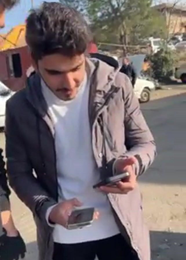 Two men are standing outdoors, one wearing a black turtleneck and the other wearing a gray jacket, looking at a mobile phone in the second man's hand
