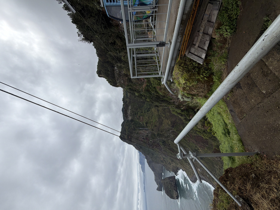 The image depicts an exterior view of the Achadas da Cruz Cable Car station, situated on a steep coastal cliff in Santana, Madeira, Portugal. The scene is under an overcast sky characterized by uniform grey clouds. In the foreground, a concrete staircase descends towards the lower left, partially framed by a galvanized metal handrail system. The immediate ground features green vegetation mixed with dry foliage. To the right, a section of the cable car station platform is visible, enclosed by light grey metal railings. A light blue cable car cabin, displaying white and green markings, is docked at this platform. Below the platform, on the rocky cliff face, several wooden planks and debris are present. Two dark, parallel cable car wires extend diagonally from the lower left portion of the frame towards the upper right, traversing above a steep, verdant cliff. A narrow waterfall is observed cascading down the face of this distant cliff. To the left, the Atlantic Ocean extends to the horizon, with choppy waters and visible white-capped waves near the shoreline. Multiple rocky islets, also covered in green vegetation, are located offshore. The coastline recedes into the distance, revealing additional rugged cliffs and headlands. No individuals are present within the frame.