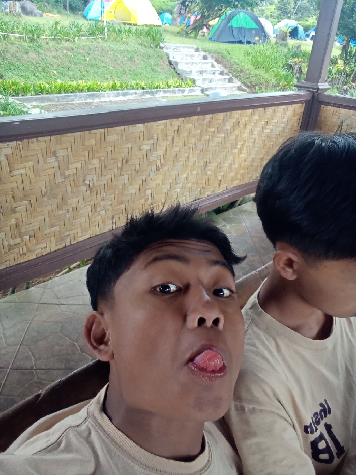 An image captures two individuals from an elevated perspective, likely a porch or balcony, at a campsite in Ciherang, Indonesia. In the foreground, a young male with short dark hair and a light-colored t-shirt is prominently featured, facing the camera with his tongue extended. His eyes are directed at the lens. To his right, partially obscured and out of focus, is another individual, also appearing to be a young male with short dark hair and a light-colored t-shirt, whose head is turned away from the camera. They are situated in front of a woven bamboo railing with a dark brown wooden top beam. A tiled floor is visible below them. The background reveals a sloping green grassy area ascending towards the left, featuring a concrete or stone staircase. Multiple camping tents of varying colors, including yellow, blue, green, and white, are pitched across the hillside. Scattered trees and vegetation are visible further in the distance. The scene is illuminated by natural daylight.
