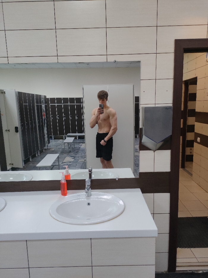 An interior view depicts a male individual taking a mirror selfie within what appears to be a locker room or changing facility in Chaikovsky, Russia