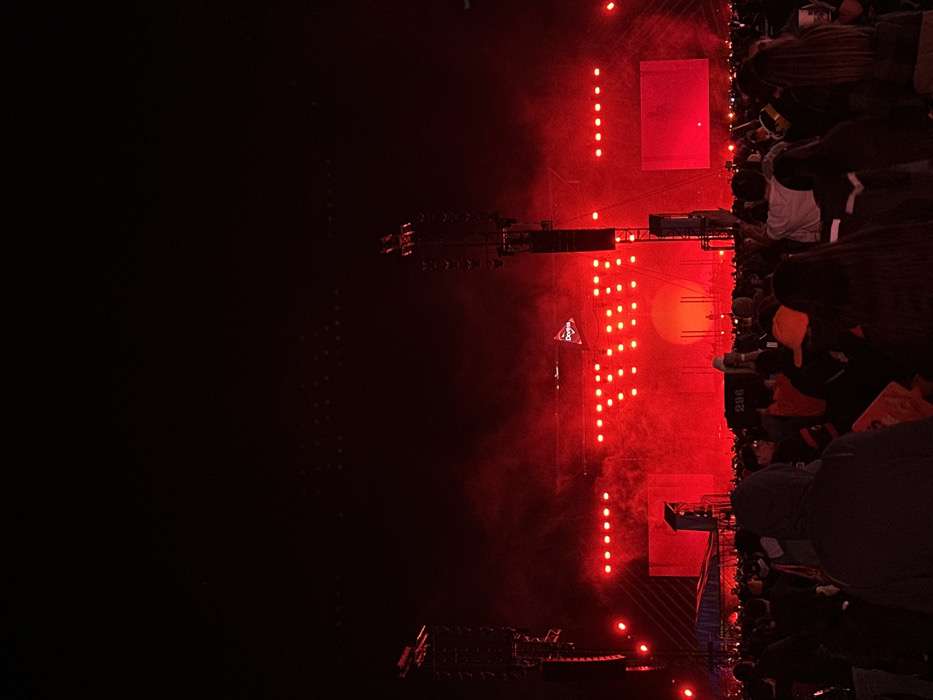 A concert is illuminated with intense red lighting, creating a dramatic ambiance. Performers are silhouetted on stage, amidst a crowd of spectators. The stage setup includes lighting rigs and a large circular backdrop. Rows of lights add depth, while smoke or haze enhances the visual effect. Crowd members, partially visible on the right, contribute to the dynamic energy of the event.