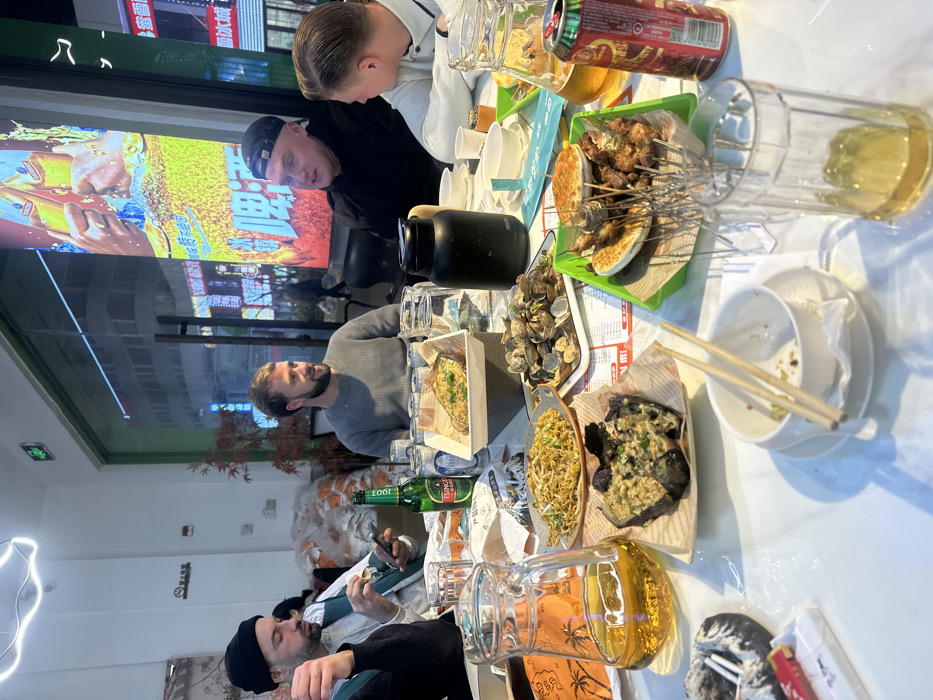 An interior shot depicts four Caucasian males seated around a white rectangular table in a casual restaurant located in Huangdao District, China. The setting is evening, with artificial light illuminating the indoor space. **People:** * **Foreground left:** A man with a black beanie and dark beard is partially visible, holding a smartphone in his right hand. He wears a light-colored vest over a dark long-sleeved shirt. * **Mid-ground left:** A man with short brown hair and a beard, wearing a grey long-sleeved sweater, smiles while looking towards the right. * **Mid-ground right:** A man wearing a black baseball cap and a dark top is engaged in conversation, facing the man to his right. His mouth is open. * **Foreground right:** A man with swept-back blonde hair, wearing a white collared shirt, listens intently, looking towards the man in the black cap. **Objects:** * **Table items:** The table is laden with multiple dishes, including a plate of stir-fried noodles, a plate of clams, grilled eggplant, and a basket of various skewers (meat, vegetables) with flatbread. A green bottle of Tsingtao beer stands upright. There are several clear glass pitchers and mugs containing light-colored liquid (likely beer), some partially consumed. A black insulated water jug is near the center. Used white bowls with chopsticks, empty glasses, and a red soda can are also present. * **Restaurant interior:** White walls, a neon light fixture on the ceiling, and a large window comprising the right wall. A small, sparse artificial tree with reddish leaves is positioned near the window. A stack of white bags or packaging is visible against the left wall. A "No Smoking" sign in Chinese characters is on the left wall. * **Exterior view through window:** The window looks out onto a brightly lit city street at night. A large, illuminated vertical sign advertising Tsingtao Beer, featuring two hands clinking bottles, dominates the exterior view. Other neon signs and building lights are visible, indicating an active urban environment. **Actions/Interactions:** The men are engaged in dining and conversation, with various food and drink items distributed across the table. One man is observed using his phone. The focus of the interaction appears to be between the two men on the right side of the table. **Environment:** The scene takes place inside a well-lit, presumably Chinese restaurant, with the exterior urban landscape visible through the large window. The atmosphere is casual, consistent with a group dinner or social gathering.