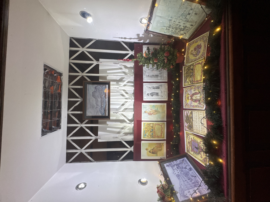 room with various art and decor elements. A framed picture hangs against a wall with metal crisscross reinforcement. Nearby is a small stained-glass window. A display area features several framed artworks, including old illustrations and architectural depictions, arranged vertically. Garland with small lights borders the display, and small floral arrangements are present at the top and bottom. The room is illuminated by ceiling lights.